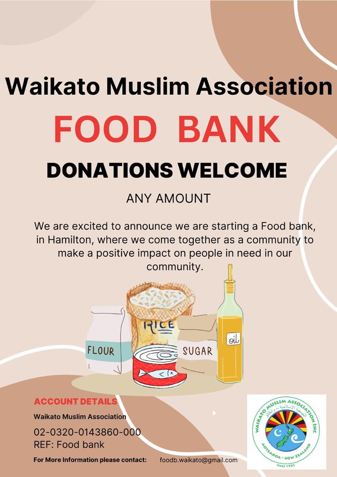 Alhamdulillah, we are excited to announce the launch of a new food bank in Hamilton by the Waikato Muslim Association (WMA). Your generous donations can help us make a significant impact on those in need within our community. Please contribute any amount you can to support this noble cause.