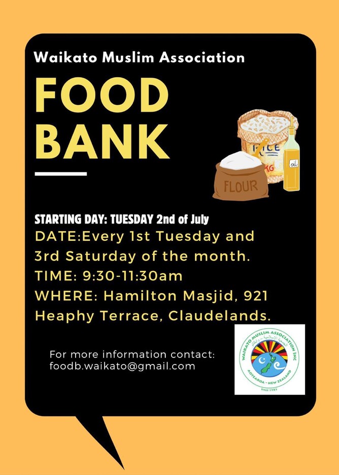 Inshallah our Food Bank will be starting on Tuesday, 2nd July 2024. We will be distributing food every first Tuesday and third Saturday of the month from 9:30 am to 11:30 am at Hamilton Masjid, 921 Heaphy Terrace, Claudelands.