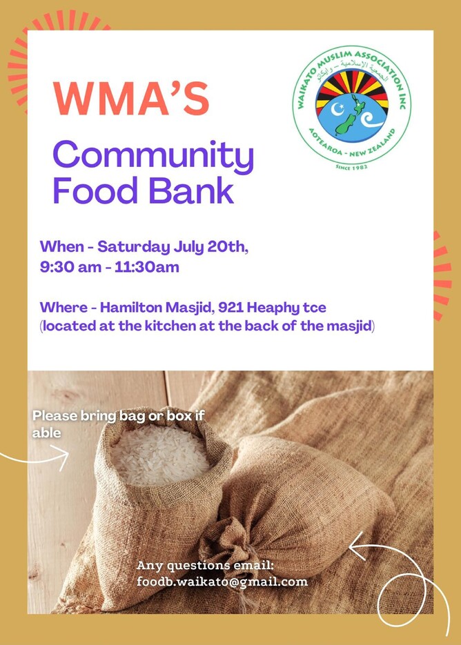 Inshallah we will be distributing food again on Saturday 20th July from 9:30 am to 11:30 am at Hamilton Masjid, 921 Heaphy Terrace, Claudelands.
