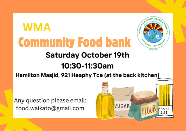 Inshallah we will be distributing food items again on Saturday 19th October from 10.30am to 11:30am at Hamilton Masjid, 921 Heaphy Terrace, Claudelands.