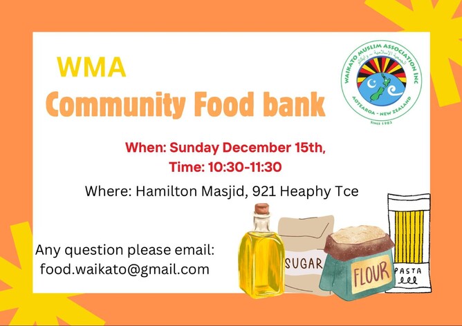 Inshallah we will be distributing food items again on Sunday 15th December from 10:30 am to 11:30 am at Hamilton Masjid, 921 Heaphy Terrace, Claudelands. (Please take note of the new date and time for this distribution.)