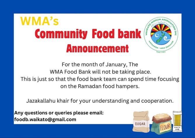 The WMA Food Bank will not be taking place in January as the team is focusing on the Ramadan Food Hampers. We hope you understand and inshallah we will see you next month.