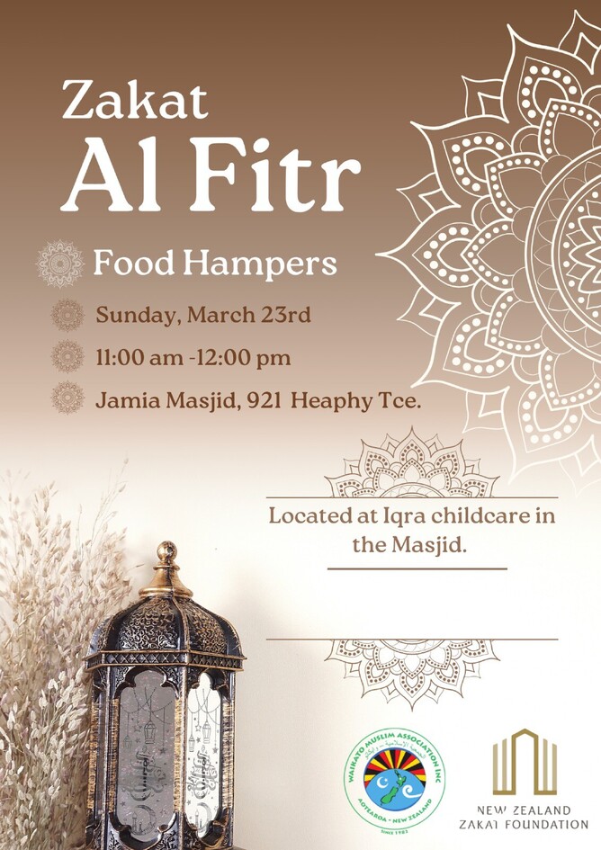 Distribution of Zakat Al Fitr Food Hampers on Sunday, March 23rd, from 11:00 am to 12:00 pm at Jamia Masjid, 921 Heaphy Tce.