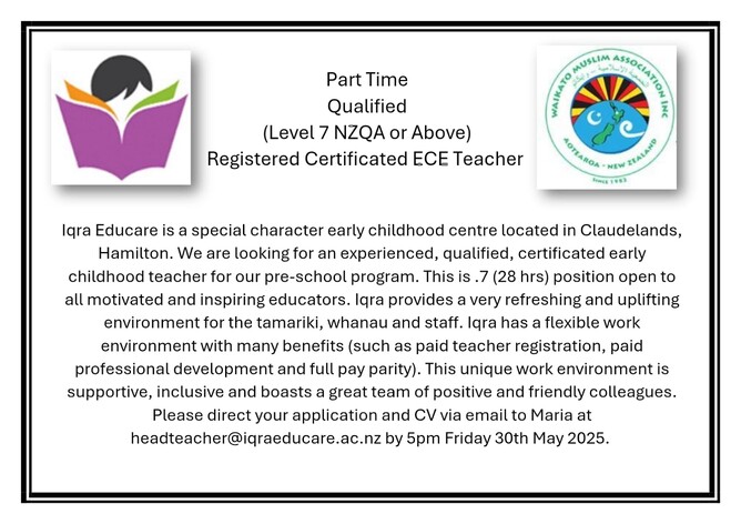 IQRA Educare are looking a part-time, qualified Early Childhood Education (ECE) Teacher. If you or someone you know is interested, please have a look at the attached job posting.