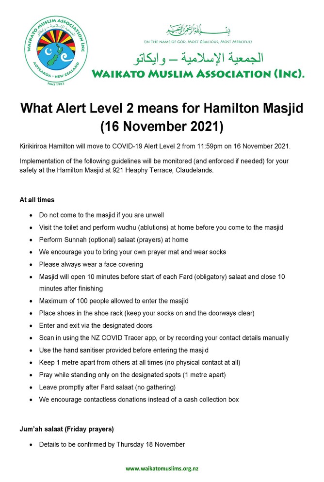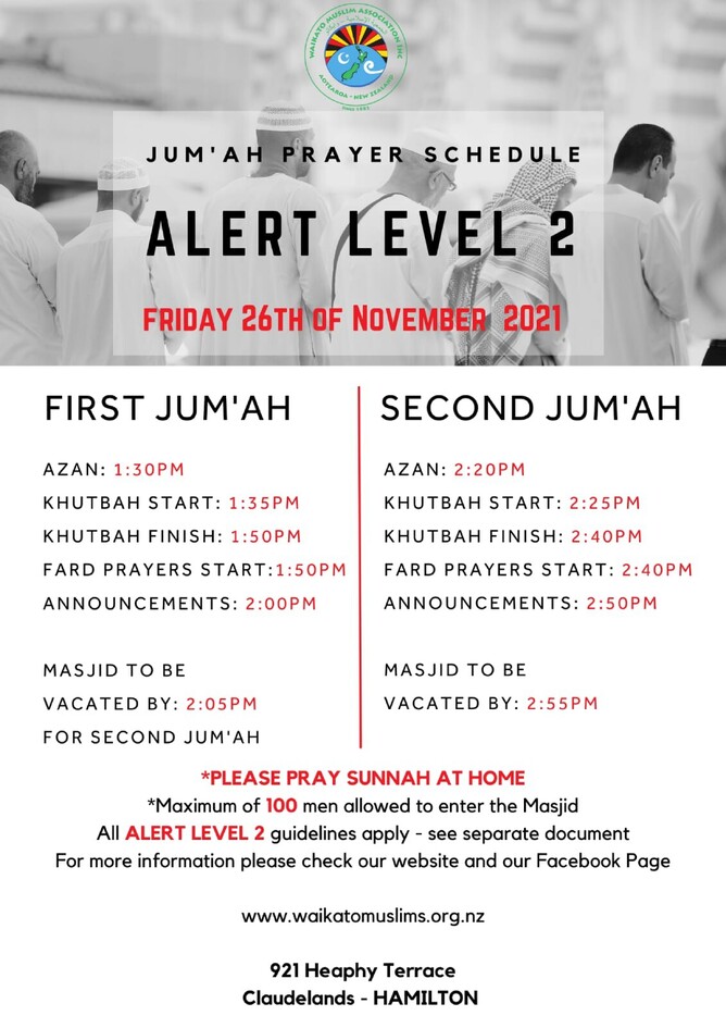 Jum'ah Prayer Schedule Alert Level 2 Friday 26 November 2021