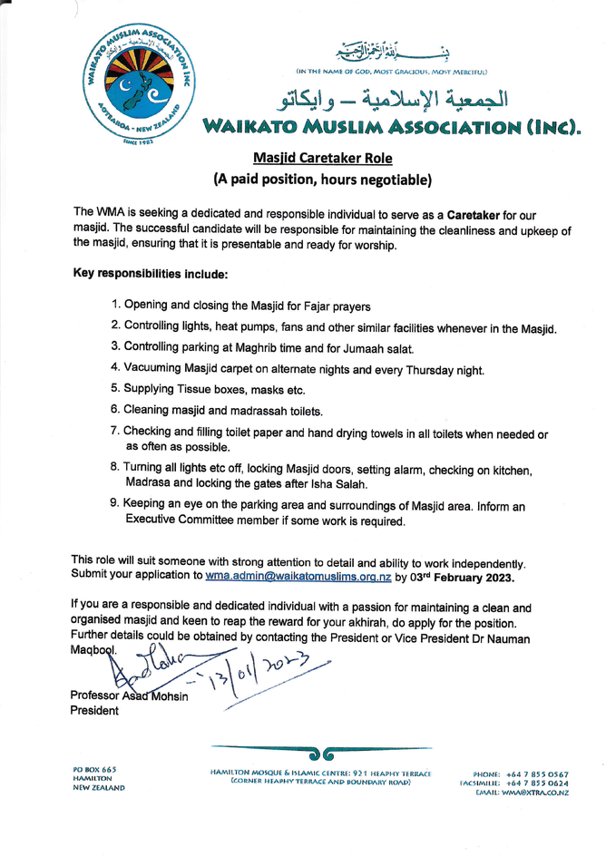 WMA are looking for a capable individual to be a Caretaker for our Masjid and to fulfill the following task listed in the photo above. This is a paid position and hours are negotiable: